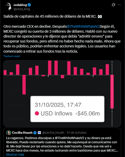 In any case, the community’s complaints generated a statement by Cecilia Hsueh, CSO or security director of MEXC with two months in office, who stated on October 31, 2025: “our finances are strong; the problem in question is operational. And we will solve it. Previously advertisement reviews within 24 hours and bonuses for errors. Despite all this, the exchange suffered massive withdrawals.