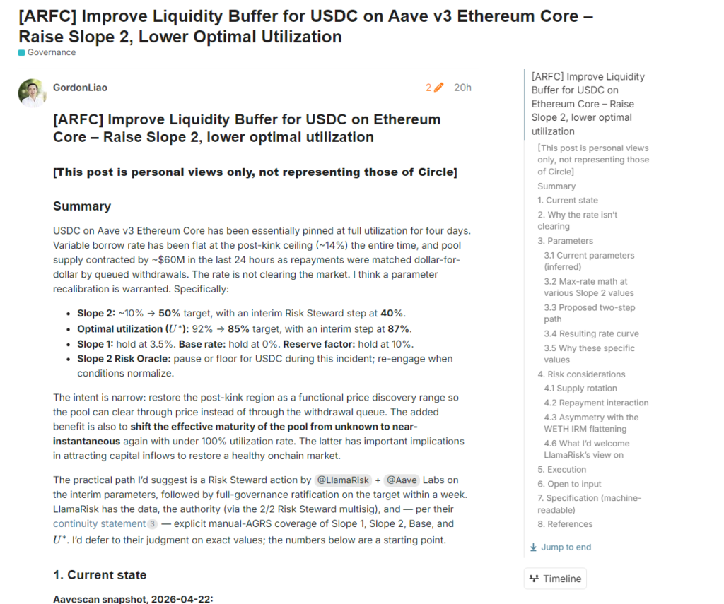 Circle presented an emergency proposal on Aave’s governance forum on April 22 to modify the interest rate parameters of the USDC pool, which has been paralyzed for four days with 99.87% utilization and less than $3 million available for withdrawals.